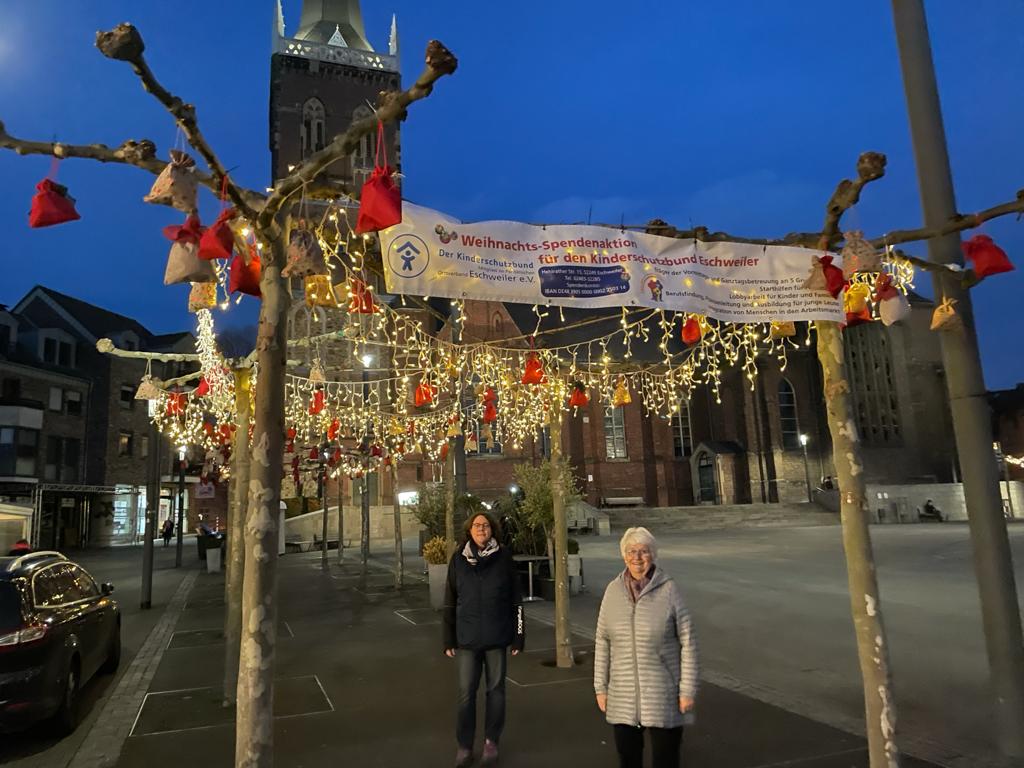Am Mittwoch, 25. 11. 2020 haben Mitglieder des Kinderschutzbundes mit tatkräftiger Unterstützung in luftiger Höhe die beleuchtete Baumreihe auf dem Marktplatz mit den neuen Geschenkpäckchen dekoriert.