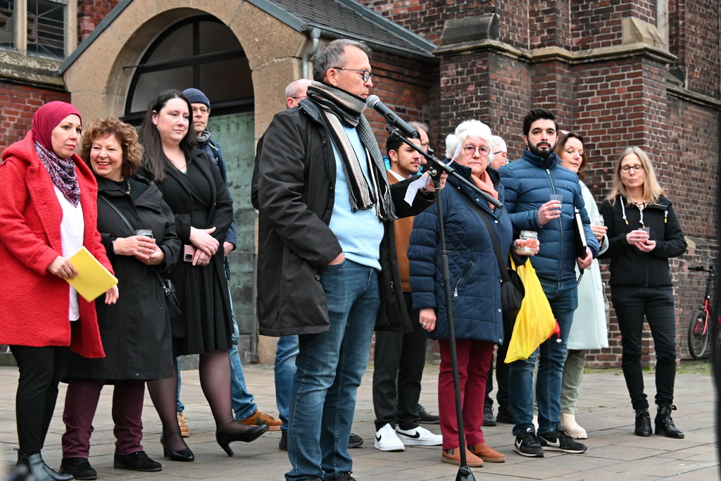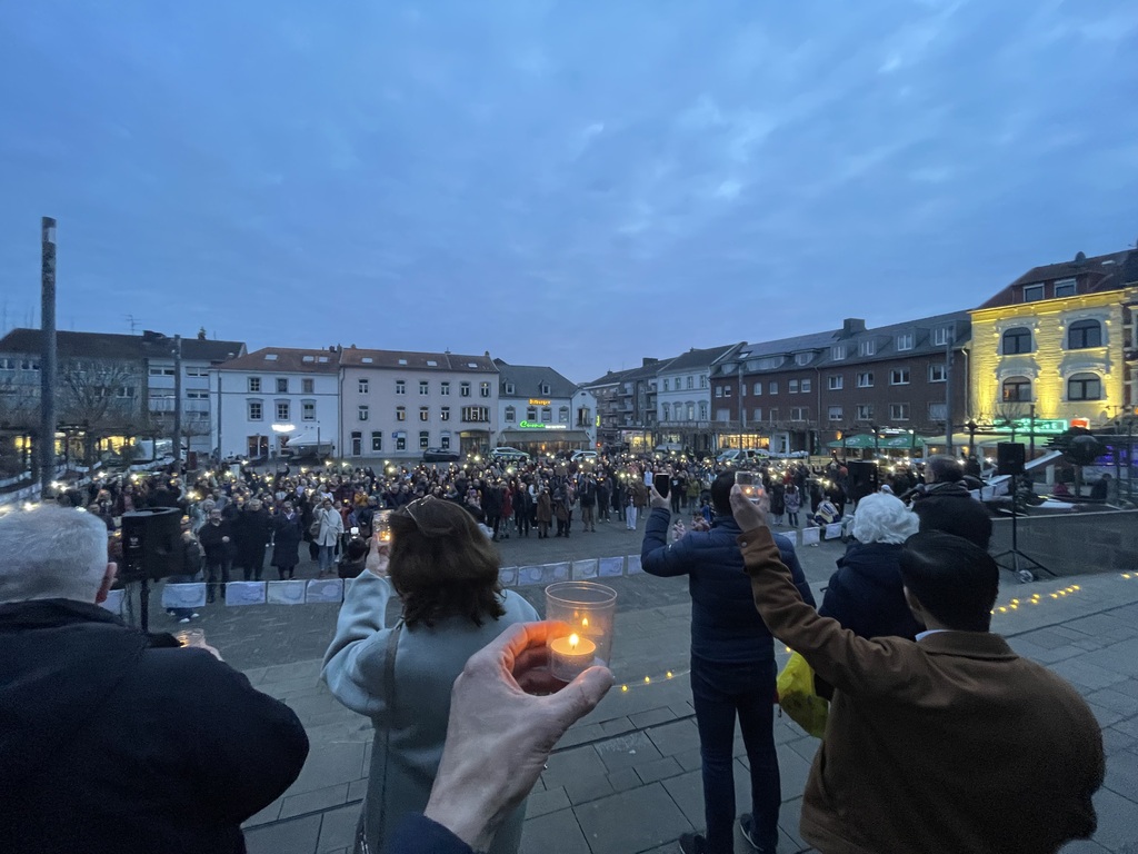 Am Abend fand dann auf dem Marktplatz eine Kundgebung mit mehreren hundert Menschen statt. Nachdem der Sprecher des Bündnisses, Wilfried Schmitz, die Teilnehmer begrüßt hatte, hielten neben Bürgermeisterin Nadine Leonhardt noch Amira, Schülerin des Städtischen Gymnasiums, und Bouchra Baboua, Migrationsberaterin bei der Arbeiterwohlfahrt sehr beeindruckende Reden. Zum Ende der Kundgebung und mit einsetzten der Dunkelheit leuchtete der ganze Marktplatz mit Lichterkerzen als Zeichen gegen Rasssismus und für Demokratie in unserer Stadt.