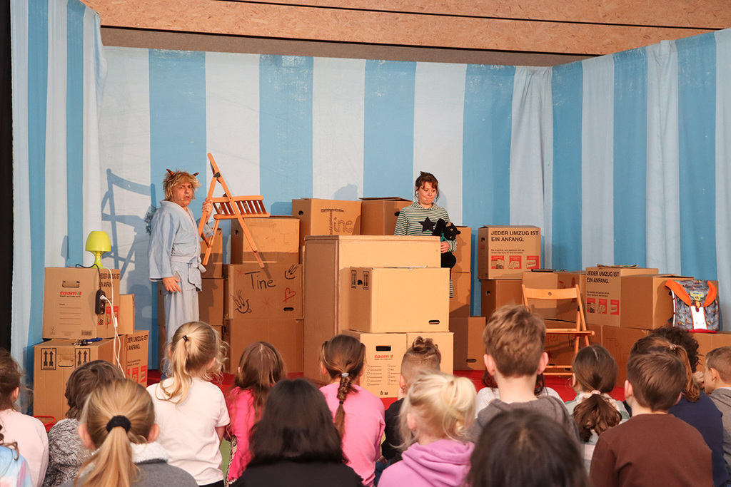 „Ganz schön blöd“, so der Name des Stückes, das von den pädagogischen Schauspielern Imke Schreiber und Massimo Tuveri auf die Bühne gebracht wurde, vermittelte nicht nur eine unterhaltsame Geschichte. Tine, die mit ihren Eltern umzieht, und der Schutzengel „Teugel“, der noch seine Prüfung absolvieren muss, transportierten mehrere Botschaften. Es ist mutig, zu den eigenen Ängsten zu stehen und sich in komischen und belastenden Situationen Hilfe zu holen, denn: „Hilfe holen ist kein Petzen und kein Verrat!“.